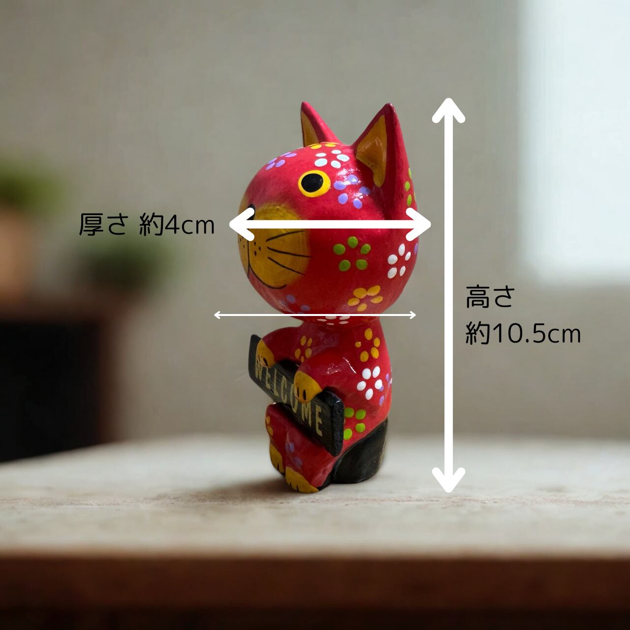 バリネコ ウエルカムオブジェは、バリの伝統的な民芸品をモチーフにした、華やかな木製の装飾品です。「welcome」と「thank you」のプレートを裏表で差し替えて楽しむことができ、あなたの玄関を明るく演出します。カラフルな色合いが、訪れる人々を温かく迎え入れてくれます。